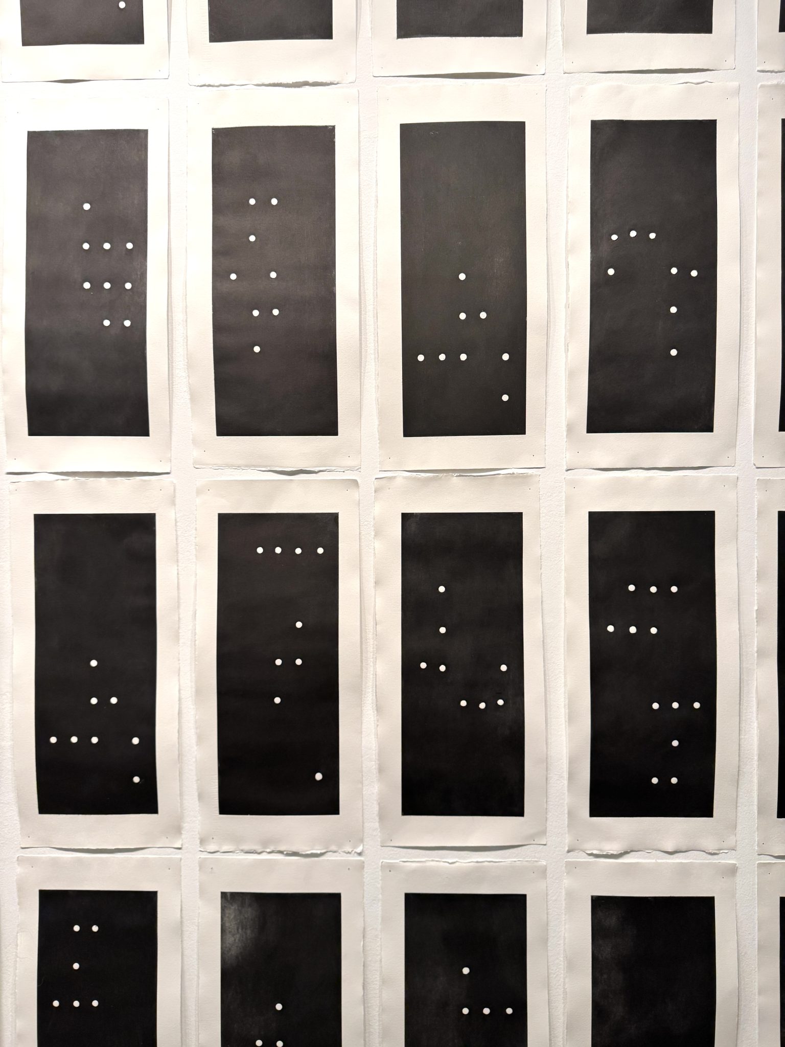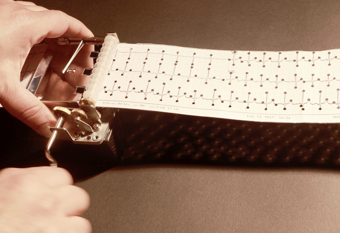 Alongside the knitting machine, dozens of prints are displayed: engraved plates punctured with fragments of the genetic code. Their appearance evokes lottery tickets, as if the artist’s act of perforation might determine who “draws” a normative chromosomal set and who does not. A third work in the exhibition is a dual-channel video presenting a music box that translates Joni’s heartbeat—recorded via his ECG—into a dissonant melody.