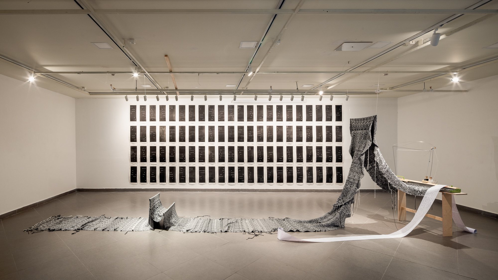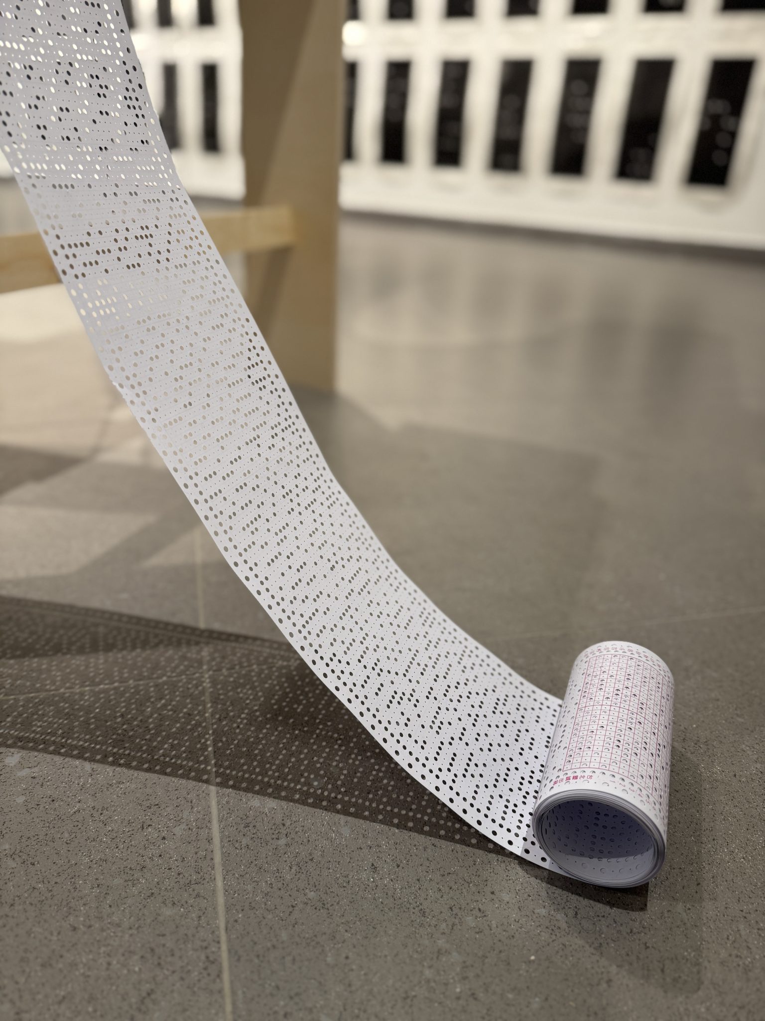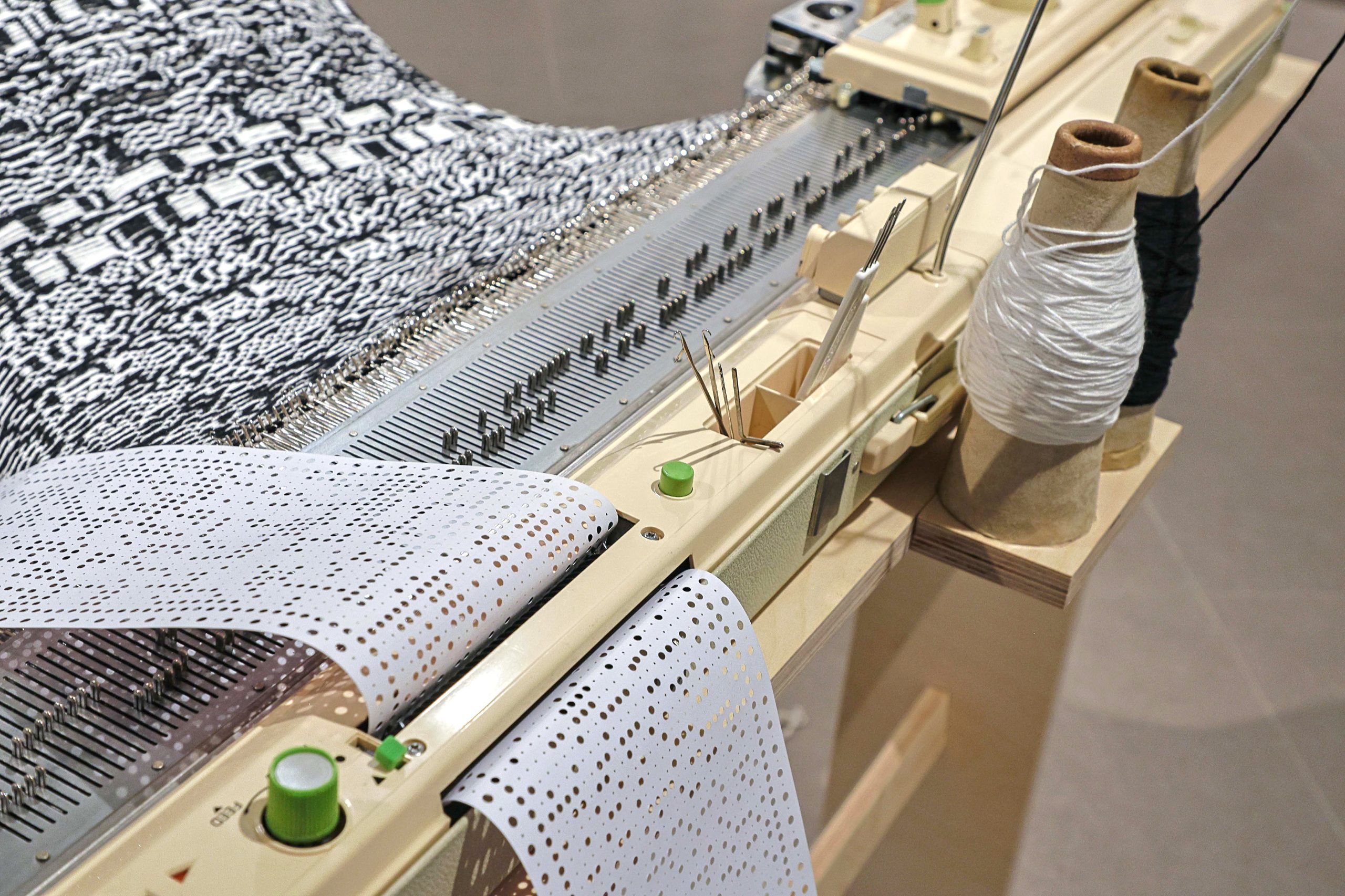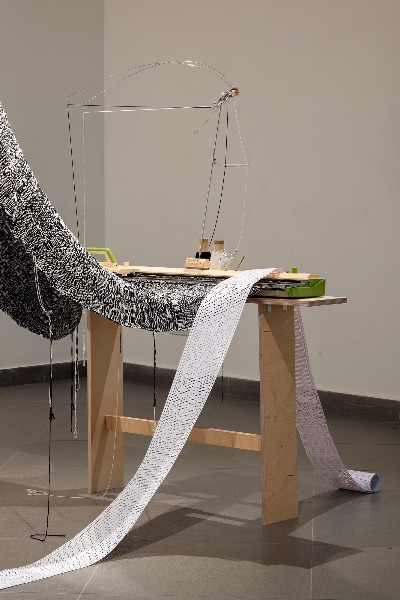 The installation traces back to the origins of binary code in the early 19th century. At its center stands a hand-operated knitting machine, activated by punch cards perforated according to the translated genetic sequence. These extended cards generate thousands of knitted rows, accumulating into a textile nearly ten meters long—an embodied poem of error.