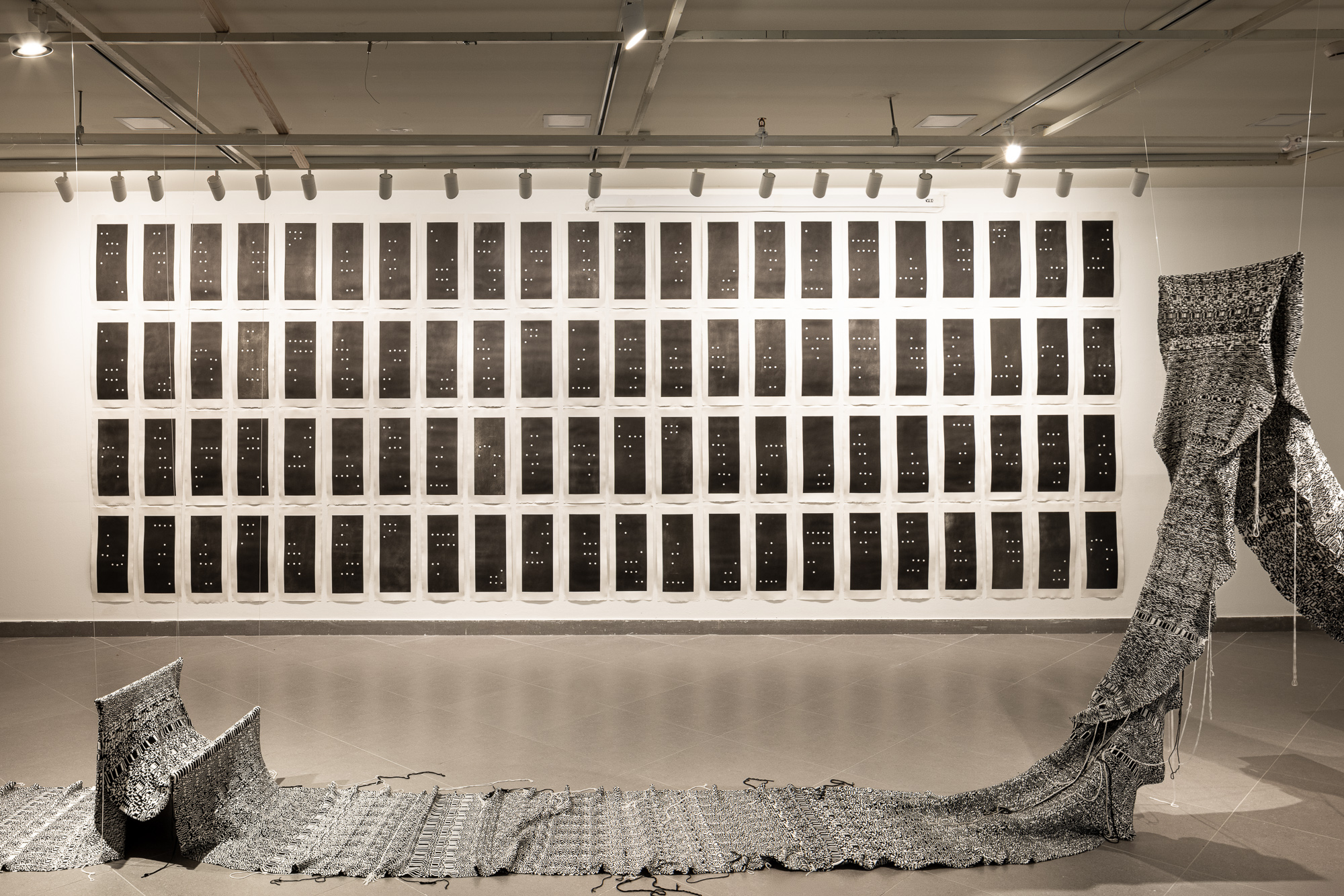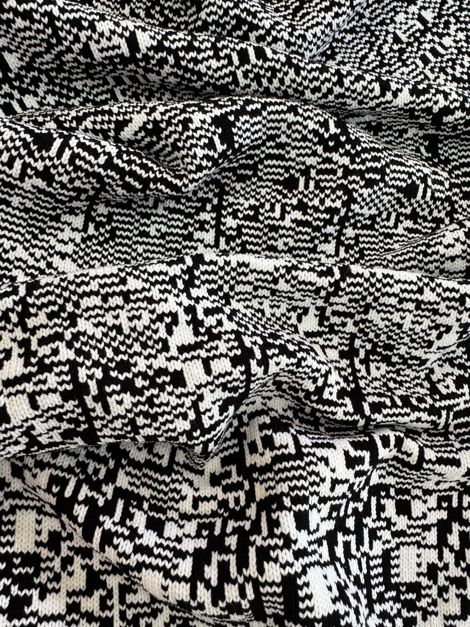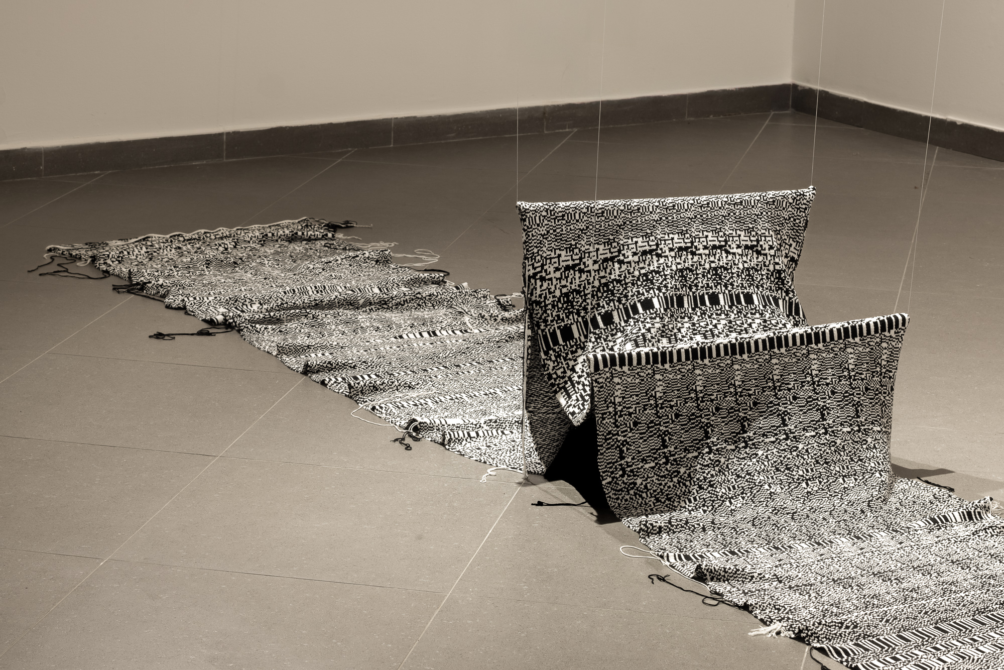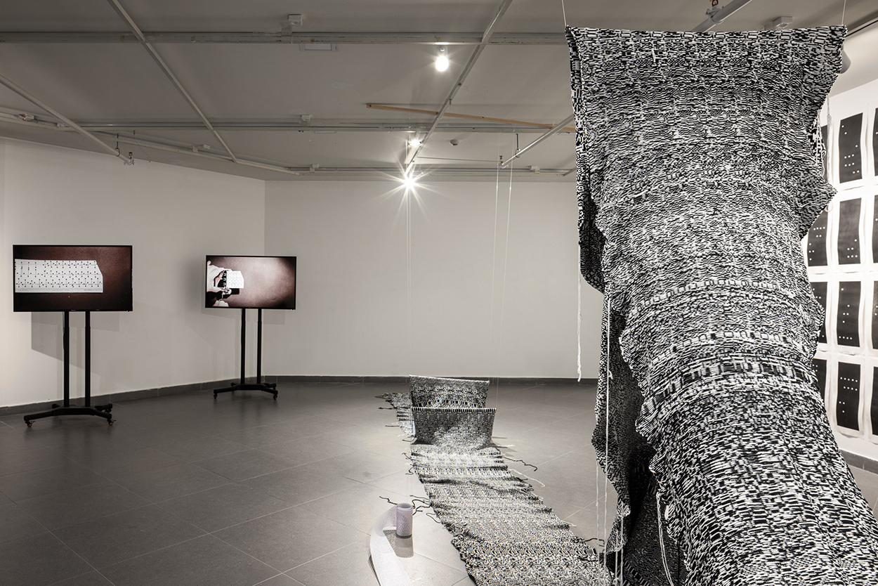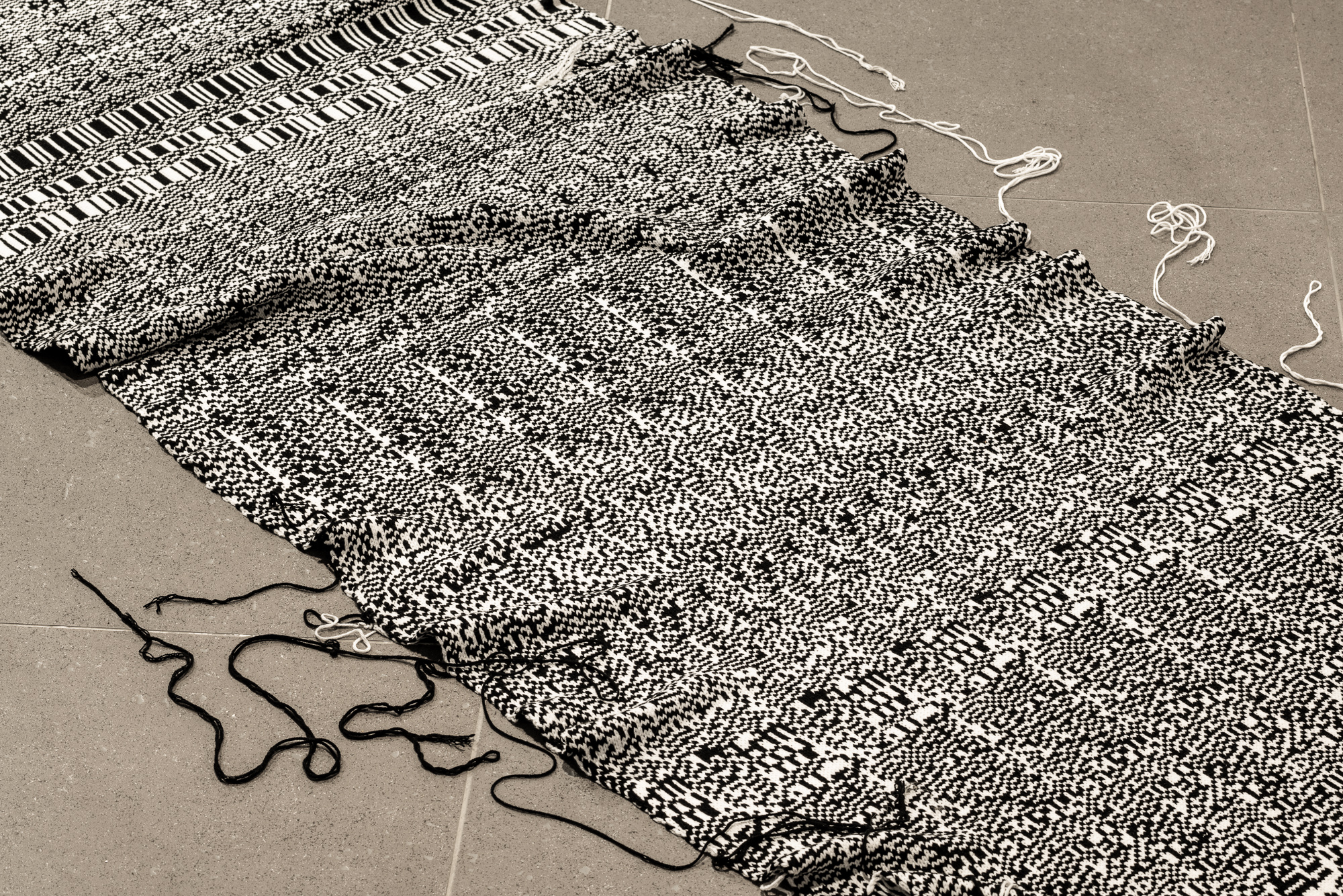 The installation traces back to the origins of binary code in the early 19th century. At its center stands a hand-operated knitting machine, activated by punch cards perforated according to the translated genetic sequence. These extended cards generate thousands of knitted rows, accumulating into a textile nearly ten meters long—an embodied poem of error.